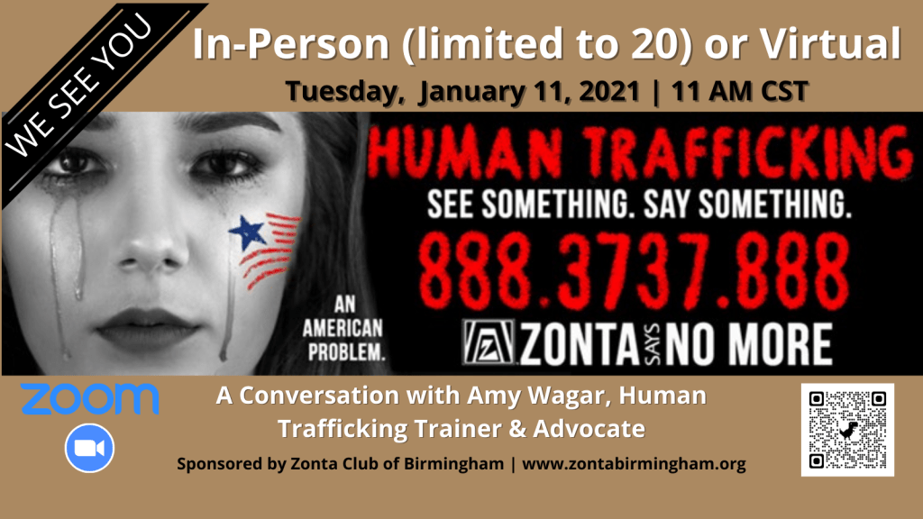 25 million people are trafficked worldwide. What is trafficking? How has it changed? Who is trafficked? What can we do? On January 11, 2021 (11 AM CST), Zonta Club of Birmingham (AL/US) will host a live, interactive Human Trafficking 101 event with guest presenter and Human Trafficking trainer, Amy Wagar, in Birmingham, AL. Amy will provide new and updated information and will be available to answer your questions. You are invited to attend in-person (limited to 20) and virtually (unlimited). January is Human Trafficking Awareness Month. Invite others to join in the conversation. Together, we CAN make a difference.