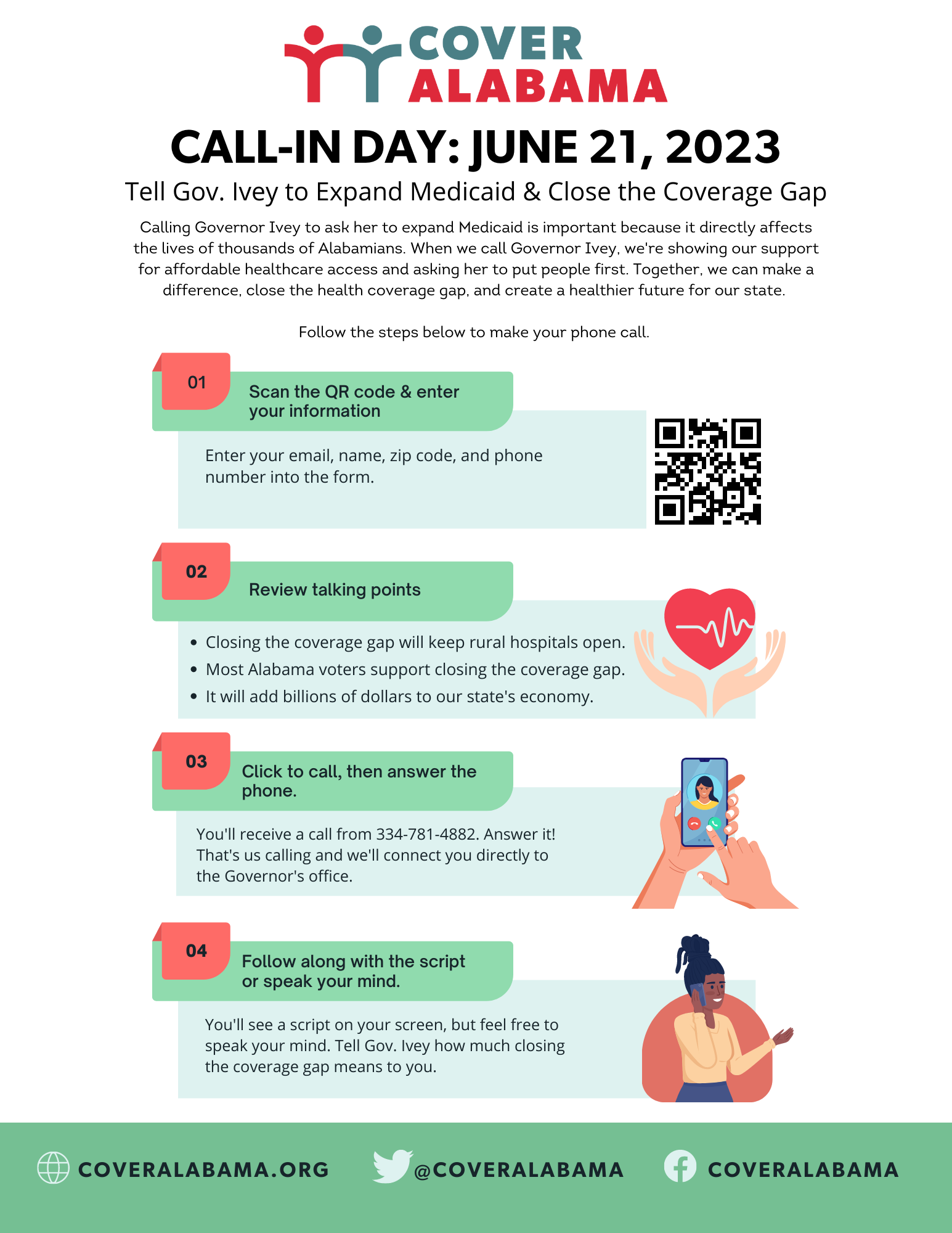 Join us today as Alabamians across the state encourage Gov. Kay Ivey to expand Medicaid and close the health coverage gap, granting affordable health care access to nearly 300,000 Alabamians in need. If you believe all Alabamians deserve access to health care, it’s time to take action and let Governor Ivey know that we stand together in support of Medicaid expansion and closing the health coverage gap.
