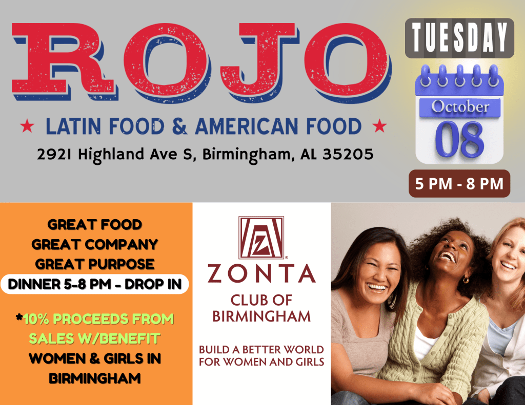 On Oct 8, starting at 5 PM, come dine with us at Rojo and make a difference! Rojo has generously partnered with the Zonta Club of Birmingham to help us raise funds to support the vital work we do for women in need across our community. 10% of all sales made during the event will go directly to our club helping us empower women and advocate for their rights.